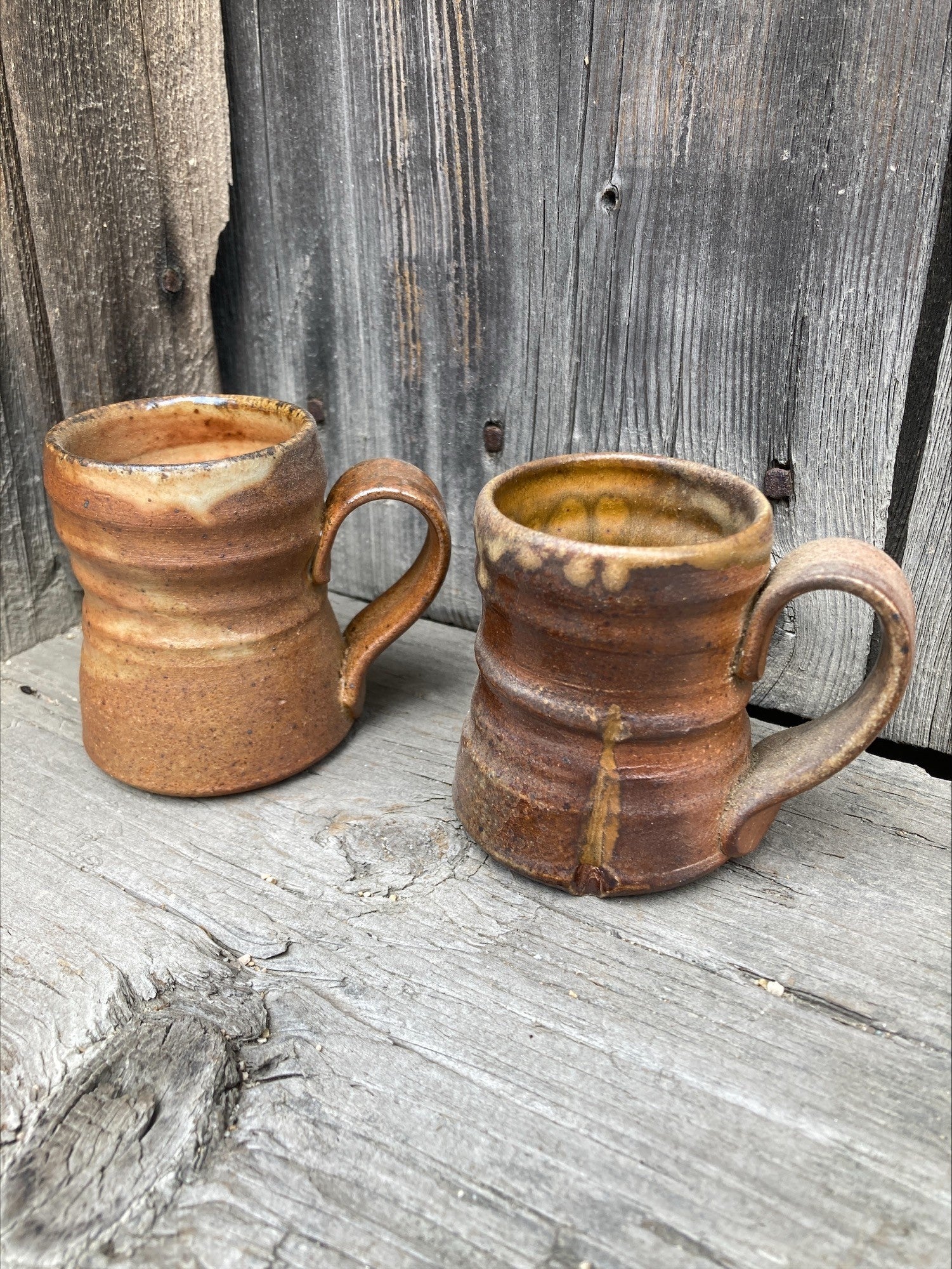 The unglazed exterior with blushing from the wood kiln accentuates the throwing rings, and a gold glazed interior offers a natural beauty.